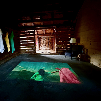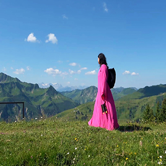 Along the way, she records her thoughts, sensations, and reflections in a Summit Diary (“Gipfelbuch”). Though grounded in a poetic and contemplative frame, Summit of Happiness displays potent feminist and political gestures through the embodied actions of the artist. By climbing through the alpine terrain in layered, brightly colored costumes and anchoring each to a swing, Ekici reclaims a traditionally male-coded motif—the solitary mountain ascent—as a site for female expression, ritual, and authorship. The act of carrying and gradually shedding costumes along the way becomes a performance of fundamentally exsistential labor, endurance, and transformation. Her presence— is marked by the colourfull costumes. Ekici simultaneously marks space and leaves a trace—a form of inscription onto the landscape, turning the private act of reflection into a public, spatial intervention. The dangerous ascent, with unstable rocks underfoot and all-around is re-contextualized as dimension of existential threat. Her journey is documented by a camera team, including aerial footage captured by drone. On July 13, Ekici completes her ascent by arriving at the fifth and final swing—this one located inside the exhibition space in Damüls. Swinging over a projection of her hiking route mapped onto the floor, Ekici reads aloud from her ‘summit diary’ and shows the 4 costumes that she had used as flags on the mountain. The writing from her diary captures not only her impressions of the physically taxing journey but also the inner terrain traversed:“Es braucht Kraft, immer wieder Kraft , die Schaukel mit mir zu schwingen.” (it requires strength; again again strength to swing the swing with me upon it). A floor projection with the 5th costume will remain on view for the duration of the exhibition, inviting visitors to trace her path and contemplate the layered dimensions of the work. (Text: Jono Wang Chu)