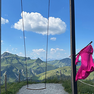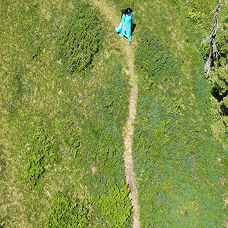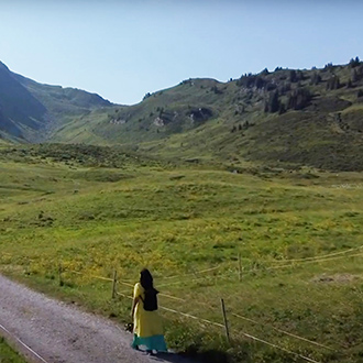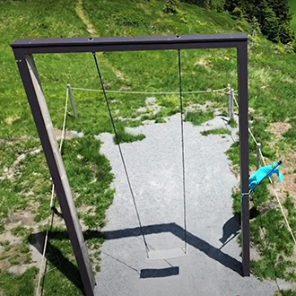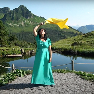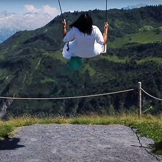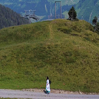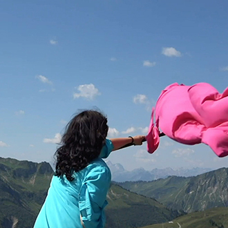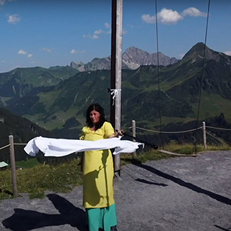In a two-part Performance Installation consisting of a Video Performance and Live Performance, Nezaket Ekici’s journey through the Damüls Mountain is first filmed and then partially re-enacted live in the museum. In the first portion of this performance, Ekici undertakes a grueling trek by foot. Climbing for miles over the course of 8 hours in scorching summer heat, she reaches all 4 Swings on Damüls Mountain (also appropriately called ‘the land of Swings’) while wearing multiple vibrant costumes layered atop one another. At each swing she takes off a costume and affixes it like a summit flag at that location. In the second portion of the performance, Ekici sits in her final costume on the last swing, now installed in the museum, reading from her ‘Gipfelbuch’ (summit diary). Named Summit of Happines (“Gipfel des Glückes), this performance installation depicts the existential nature of Ekici’s solitary hike.