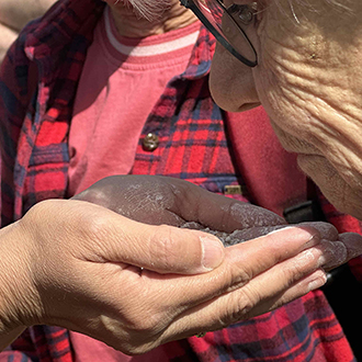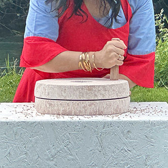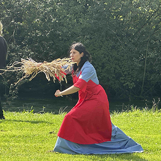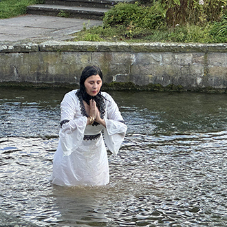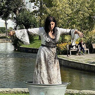 At the final station, Ekici changes into a woman’s 19th-century baking costume and prepares to create her own flower. She beats wheat onto a white sheet by hand and sifts out the grains. Pouring them into the gristmill, she grinds the grains into fresh flour, inviting onlookers to smell it—collapsing the distance between past and present through sensory memory. Finally, she steps back into the river and releases the flour into the air. The powder, suspended in light before dissolving into water, becomes a final gesture of transience: a blessing, a benediction, a return. In this ephemeral act, the performance closes not with preservation but with a sense of clarity and calm—acknowledging that even the most vital labors are eventually washed away by time.