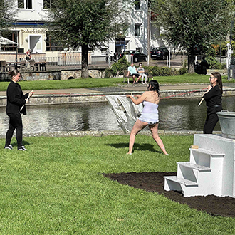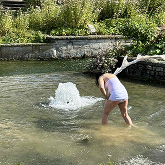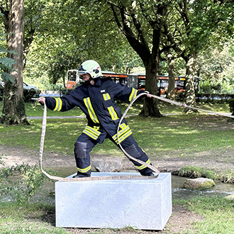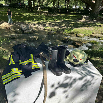 Moving through 3 different locations along the Pader, the performance is akin to Parkour. Ekici engages in a number of distinct activities which re-enact the specificities of professions from 150 years ago. Ekici specifically chooses “ausgestorbene Berufe” or in English, vanished trades—occupations which either do not exist, or do not exist in the same way as before. She sullies herself in dirt and proceeds to scrub herself clean in a large metal basin, much like (laundresses) women who would’ve washed clothes in this river 150 years ago; she hangs that same white costume to dry, held up by her two assistants on a clothesline. Then, balancing a birdbox on her head, she walks to a new part of the river. Here, Ekici dons a firefighter’s uniform, and her assistants begin the arduous task of scooping water from the stream, and passing it along in a chain.