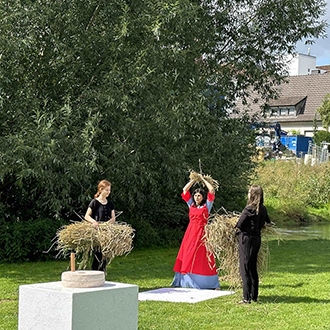3 Costumes, pedestal, metal water basin, water from the river Pader, metal pails, robe, wheat, gristmill, fireman’s costume, hose, birdbox, soundboxes