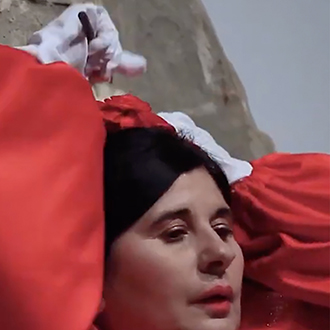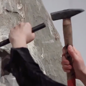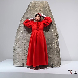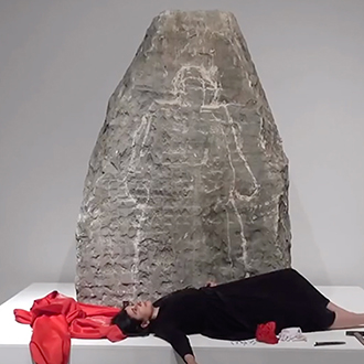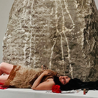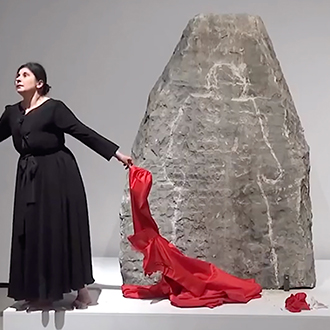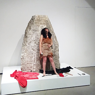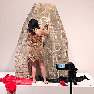 In Nezaket Ekici’s live performance, “Layers” she explores the conceptual passage of time and how its many ‘marks’ are retained in stone or other material—documenting history and culture within a physical creation. Standing in front of a stone both taller and wider than her, Ekici begins to sketch the outline of her body into the rock. As she undertakes the both physically grueling and diligent process of etching her own silhouette into the boulder, she slowly begins to take off the many costumes she is wearing. From a modern red costume, all the way to animal furs reminiscent of hunter gatherer styles, Ekici undresses in accordance to time’s reversal: her costumes represent a tracing back from contemporary to the antediluvian. Additionally, the tools she uses also highlight this retrospective theme of time: beginning with a chisel to do the carving, her final etching is made with stone instead.