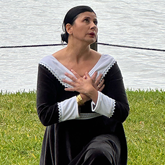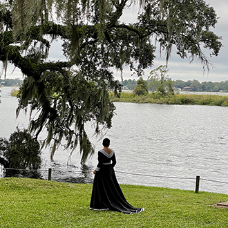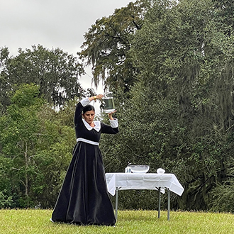 In her 2023 live performance, “Fragments of Hand Gestures”, Nezaket Ekici builds on the themes of religion and spirituality she had first visited in “Handgestus” (2020) through body purity and nature. Set, this time, in the United States at the beautiful riverside of Charleston, South Carolina, Ekici continues her ritualistic handwashing, but in three distinct locations. Dressed in the exact same costume she had worn in 2020 at the performance of “Handgestus”, she undertakes a three-part nomadic journey: first at the river-side, then at the open-pasture near a monastery, and then lastly inside the chapel itself.
