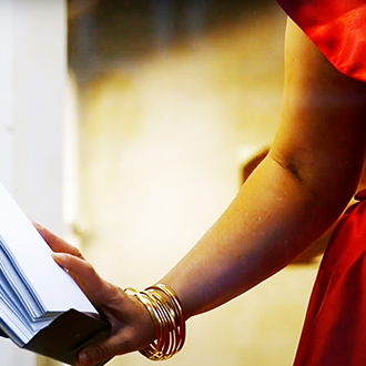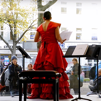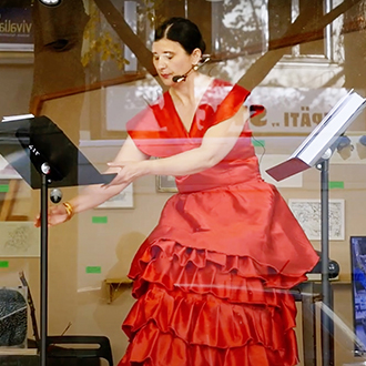Nezaket Ekici installs a space like a concert stage. Around her, music stands, and a piano chair are arranged. She takes out 3 large catalogues filled with the names of the 1303 artists, and stands in a costume inspired by the Opera Singer Maria Callas.