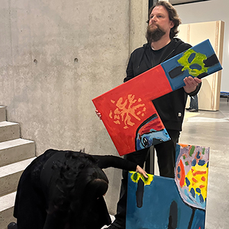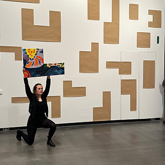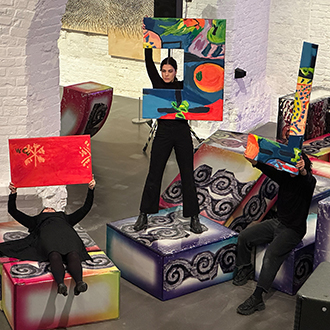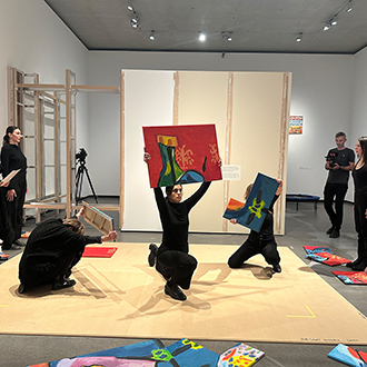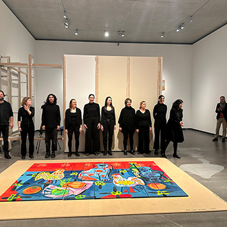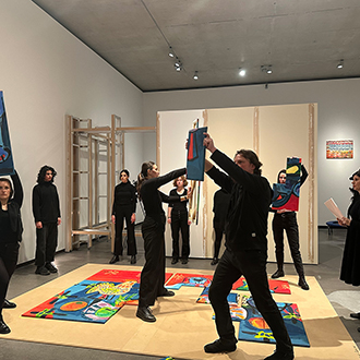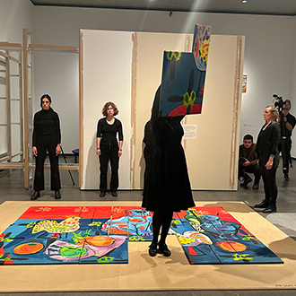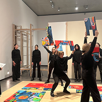 On December 2, 2023, Ekici conducted her live performance at the Kunsthalle, accompanied by several performers. Each performer carries an oversized fragment of the painting and moves independently through the museum, weaving through its architecture and visitors like nomadic travellers. Each one of them appears in a different corner or hall of the museum; in isolation, they emerge towards the common area in which the puzzle will eventually be laid down and made complete. Their movements constitute a kind of magnetism: as isolated fragments their meanings are reduced to crypticisms—only in their proximity to each other in specific-place are they essential, their social importance realized. As they move, they shout aloud single words they associate with their fragment—creating a chorus of isolated meanings that hint at a collective whole. These spoken associations give each fragment a provisional voice, suggesting that even when separated, parts still carry stories.