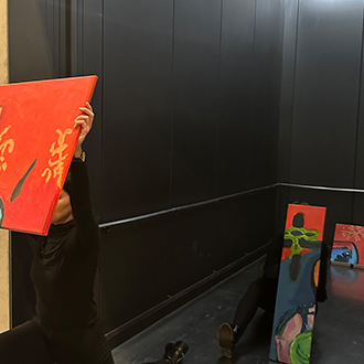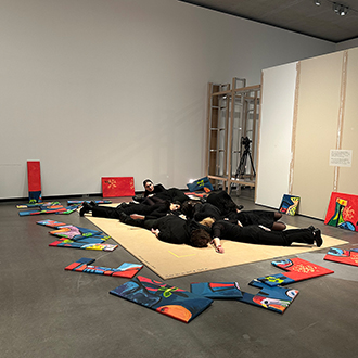 Beyond the performance itself, Searching Another extends into the museum space as a participatory invitation. After the painting is complete, the performers stand around their creation, each person dressed from head to toe in black, and begin chanting. What looks like an arrangement of mourning becomes one of pride and self-realization: they face thei