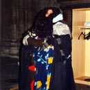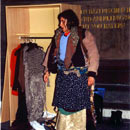 A wardrobe stands in the center the Performance. It is taken from my house and is set up here in the exhibition place. The overcrowded wardrobe is equipped with shirts, T-shirts, pants and dresses. Everything is what in it, is unpacked and is arranged on the ground(bottom). Now are drawn of the row after all garments on top of each other, since nothing more lies on the ground(bottom). The parts have an effect finally on my body like a garment bag or patotoe sack. I take over (transformation) with it the function of the wardrobe and i am the wardrobe, because I carry all garments. Aim the Performance is to be reshaped it to the body to the paragon of a Kulturmonomentes. The alive body with all garments should be translated in the language of the art by this perspective change in a shapeless fossilized culture-statue. In a further sense should be pointed out the consumption which is demonstrated with the overabundance of dresses. The culture-ballast which is symbolized by the a lots of dresses, has an effect on the body like a movement-hindering weight. Which possibilities the person has now still to free himself from this situation?