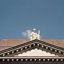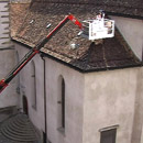 The Performance Mimesis refers to one of both feminine figures of white marble (Helvetia and Rätia), which were made by the Genevese artist James Vibert (1910). They are on both sides of the facades of the current post-office building (formerly post telegraph and duty building, built in 1902-04) on Grabenstrasse 20 in Chur. The figures refer to meaning of the building. For example, one figure carries letters in the hand and the other figure a torch. The artist obviously connects the symbols of Switzerland and Chur with those of the post office to one symbol. the figure chosen by the artist (Nezaket Ekici) carries a long garment on which the Swiss cross is to be seen. She holds with the right hand the edge of a the rope and with the left hand a torch. She sits graceful and handsome wlooking downwards. This figure is copied by the artist and transformed: She becomes a living sculpture. Besides, the figure is not simply copied, but also enriched. The figure comes to life by using acoustics and color. The artist makes sound, using a post horn without disturbing the basic intention of James Vibert, but enriching it´s expression. The post-office building lies outside, shortly before the oldest part of the town. Now the artist as a living sculpture moves into the oldest part of the town, by beeing replaced onto different roofs. The artist sits down on three different buildings of the oldest part of the town from 3 different times. The selected roofs are 1. the sacred building (St. Martin church, Martinsplatz, Late-Gothic facility from 18 centuries), 2. the canton library state archives, Karlihofplatz as well as 3. the Prophanbau (commercial building from 60-70 years of the last century, about the restaurant Capellerhof, on the grain place). The sculpture itself comes from the time of the symbolism. Therefore the artist confronts different times with each other. The Performance extends the figures particularly by acoustic aspects, without giving away it´s primary meaning: the Performance creates a general connection of time and area. It is a quiet Performance with an auditory event in it.