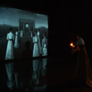 The painting "Spitzenprosesion" by Paul Delvaux from 1934, who is a Surealist from Belgium, raises many questions. Who are the women, whose back is only to be seen? Where do they go? The way seems to be not only long but eternally and the scene leeds to the impression of being frightened. The frightening scenery in the painting is to be partly transformed into reality. The painting is large scaled projected to the wall. By intention the painting will be shown in black and white (not in colour). And one woman in the middle of the painting is taken out to be replaced by the artist. The music of 2001 "A space odyssey/lux Aeterna" by Stanley Kubrick (composed by Gregory Ligetis) is mostly dominated by a woman choir. These women are almost crying and create an infinitely frightening atmosphere. The woman choir refers directly to the women in the painting. The music (7 minutes) is repeated for 1 hour. The artist walks in her performance in slow motion towards the projection on the wall, till she reaches it. Both, music and walking will implify the long way and procession. The whole scene affects the viewer like a dream world. This effect is strengthened after each 7 minutes. To set a contra point, every 7 minute sequence will be ended with the sound of a fast passing train with the projection going black, leaving traces of fog, when it is gone. An important component in Pauls work is the railway So the train completes the scene. I create as well a further relationship with Paul Delvaux pictures, in which he unites many absurd elements.