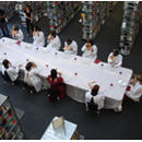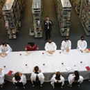 The performance tries to create a linkage between the library of Stuttgart and the Christian believe in the bible. This refers to the first quotation in the new Testament after Johannes chapter 1 verses 1-5; "At the beginning their was the word, and the word was with God; and God was the word...". The performance takes place the whole evening revolving and offers each phase 12 places for the visitors up to 20 min. The table reminds on the last supper. The participants are welcomed at the entrance and get next to a white smock as well a black sleep mask and are accompanied to the table. The table is covered with a white taqle colth, white porcelain plates and wine glasses with red wine. On each plate is a piece bread, that shows a single Letter. The participants shall free their minds by seeing nothing and even strengthen all their other senses, tasting, hearing, feeling and smelling. The artist now invites the participants to go toward the bread and try To find out the letter, as well to smell the letter, to eat a piece. After this, the participants have the task to guess, what word consisting out of 13 letters this could be. In all cases, this will be a word taken out of the bible, describing the inner thought of the christian belief.