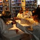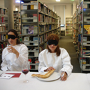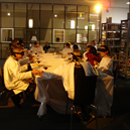 2 white smocks, 12 sleping masks, 13 chairs , 13 plates, 13 glasses of wine, Red wine, Letters made of bread, 5 assistens , light