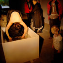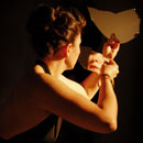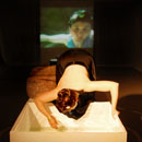 Inspired by Caravaggio´s Narziss, a painting 1598 1599, which expresses more than other representations of his topic the mental attitude of the mythological figure Narziss. The figure of Narziss can be seen crouching near to a water, he seems to consider. Narziss is loaded with a vital importance, forcing me to complete the painting with regard to the mythology behind. What the painting lacks, is the completion of Narziss history, therefore Narziss dies by shock, when a stone falls into the Water reflecting his distorted face,because he believes, he has become ugly. In the 1,30 h Performance the artist (Nezaket Ekici) sits in front of a water basin, lookinginto it. A ray of light, set at the roof, spotlights the artist and a part of the water lying before her. With the help of a Camera a close-up of the artists face is projected live from the surface of the water to the wall in the next room. The artist throws from time to time stones into the water, which destroy the perfect reflection of her face for moments. As a result, the viewer sees the face blurred for moments on the projection.