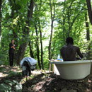 In der Performance Installation "Living Room" entdeckt der Betrachter auf dem Weg durch den Wald (Salesgraben, Fürstenfeld Össterreich) 10 Akteure aus unterschiedlichen Kulturen (Afrika, Korea, Türkei, Österreich, Serbien und Deutschland) und die Künsterlin in Badewannen. Die weissen Badewannen unserer heutigen Zeit werden aus ihrem ursprünglichen Ort des Wohnraums herausgenommen und in die Natur verpflanzt. Dadurch wirkt das Szenario skuril: Das Bad wird gleichsam renaturiert. Geschichtlich gesehen ist die Menschheit seit den frühen Hochkulturen mit den Themen Baden und Waschen beschäftigt. Bereits die antiken Griechen und Römer maßen der Badekultur einen sehr hohen Stellenwert bei: Vor allem stand das öffentliche Badewesen im Vordergrund. Dies änderte sich gemäß gesellschaftlicher Konventionen und neuer technischer Möglichkeiten über die Jahrhunderte: In der Neuzeit tritt das öffentliche Baden langsam hinter das private Baden zurück, wodurch sich das öffentliche Baden in ein privates Baden und damit in einen intimen Vorgang verwandelt. Fast könnte man meinen, hier einen Aspekt der Identitätsbildung des neuzeitlichen Menschen gefunden zu haben. Mit Gertrude Stein ließe sich paraphrasieren: Ich bin ich, weil ich ein Bad habe. Die Badenden nehmen ihre rituelle Waschung in der Natur vor und gliedern sich gleichsam in den Naturraum ein. Die Betrachter hören, riechen und sehen den Wald und die Badenden. Letztere singen oder summen in ihrer Sprache und sie plantschen im Schaum. Der Name der Arbeit ist Programm: „Living Room“ steht einerseits für das Wohnzimmer und damit für den eigenen Wohnraum. Andererseits bezeichnet der „Living Room“ auch einfach nur den Lebensraum. Damit wird das Intime zugleich öffentlich. Die Arbeit bietet dem Betrachter die Möglichkeit, den intimen Vorgang des Badens auf neue Weise zu erleben und zu reflektieren. Die Betrachter können sozusagen in die Badezimmer anderer Menschen und zugleich auch anderer Kulturen hineinschauen und so die Unterscheidung von Privat und Öffentlich im Lichte der Unterscheidung Eigene und fremde Badekultur neu bewerten.